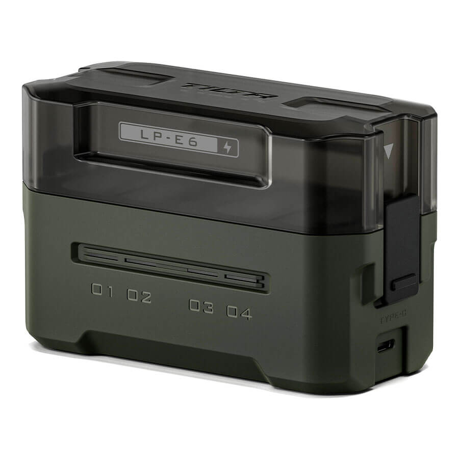A estação de carregamento portátil LP-E6 da Tilta, é o acessório definitivo para quem busca eficiência máxima no set. Projetada para suportar tanto baterias Canon originais quanto de terceiros do modelo LP-E6/N/NH, a estação compacta oferece quatro slots inteligentes, servindo tanto para o carregamento ultra-rápido quanto para o armazenamento organizado do seu kit de energia.