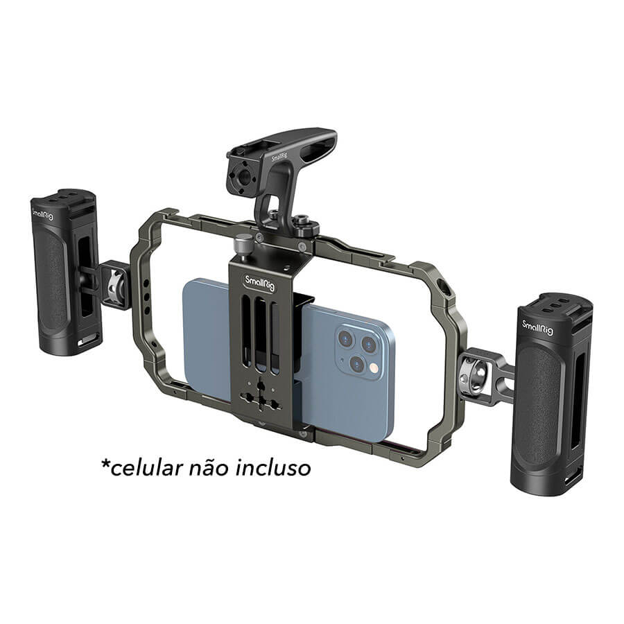 Diferente de gravar segurando apenas o celular, o kit SmallRig inclui duas alças laterais e uma alça superior (Top Handle), permitindo movimentos de câmera muito mais fluidos, capturas em ângulos baixos (low-angle) e uma pegada firme que elimina tremores indesejados.