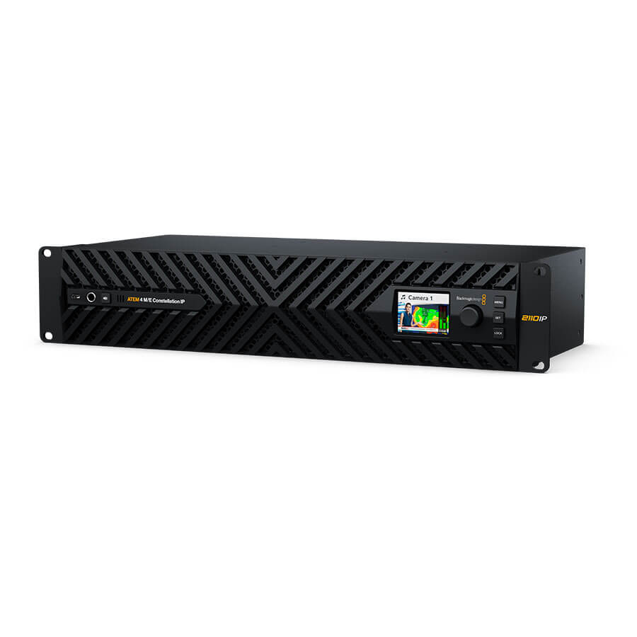 O Blackmagic ATEM 4 M/E Constellation IP, é um switcher de produção ao vivo avançado, com um design de alto desempenho totalmente nativo em SMPTE 2110 e que utiliza conexões Ethernet 100G de alta velocidade. Isso facilita a adição de conversores para combinar conexões de vídeo SDI 12G tradicionais com conexões modernas de vídeo IP SMPTE 2110. Além disso, todas as conexões de vídeo IP são totalmente redundantes e compatíveis com SMPTE 2022-7. São 32 entradas, 28 saídas, 16 Chaveadores ATEM Avançados, 4 multi visualizadores e 2 processadores SuperSource, totalizando 12 DVEs.